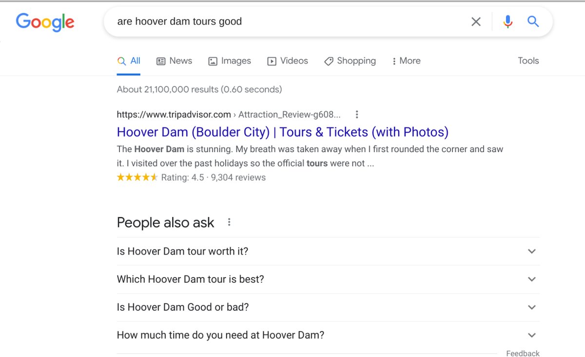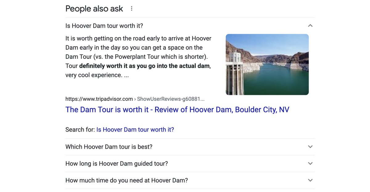 In the image above, we see that the searched keywords are “are hoover dam tours good,” which sounds like a keyword that could become popular during a certain season, or even all year round, depending on Hoover Dam’s tourism. The first search result that we get on Google is from TripAdvisor, which is a public forum, meaning that there aren’t many search engine optimized articles or blogs on the internet for say, the keyword “Hoover Dam Tour.”