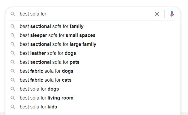 Google autocomplete is useful for users, but it also enables you to dig into possible keywords that your customers/clients are using to discover the correct product for them. Unlike keyword tools, which do not show all keywords when they do not have large search traffic, Google autocompletes displays lengthy and elevated terms.